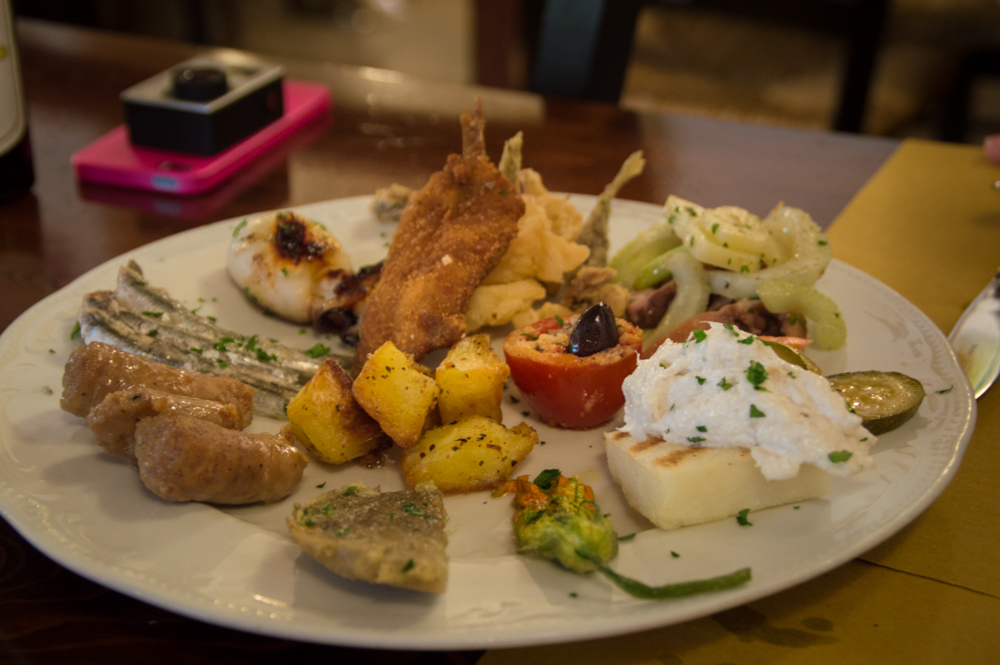 O Bacaro da Fiore é um restaurante veneziano típico, que serve massas deliciosas e também os famosos cicchetti, petiscos no estilo "tapas". Nossa parada por lá foi bem na hora do almoço, portanto, optamos pelos tradicionais petiscos de entrada e massas frescas como prato principal.