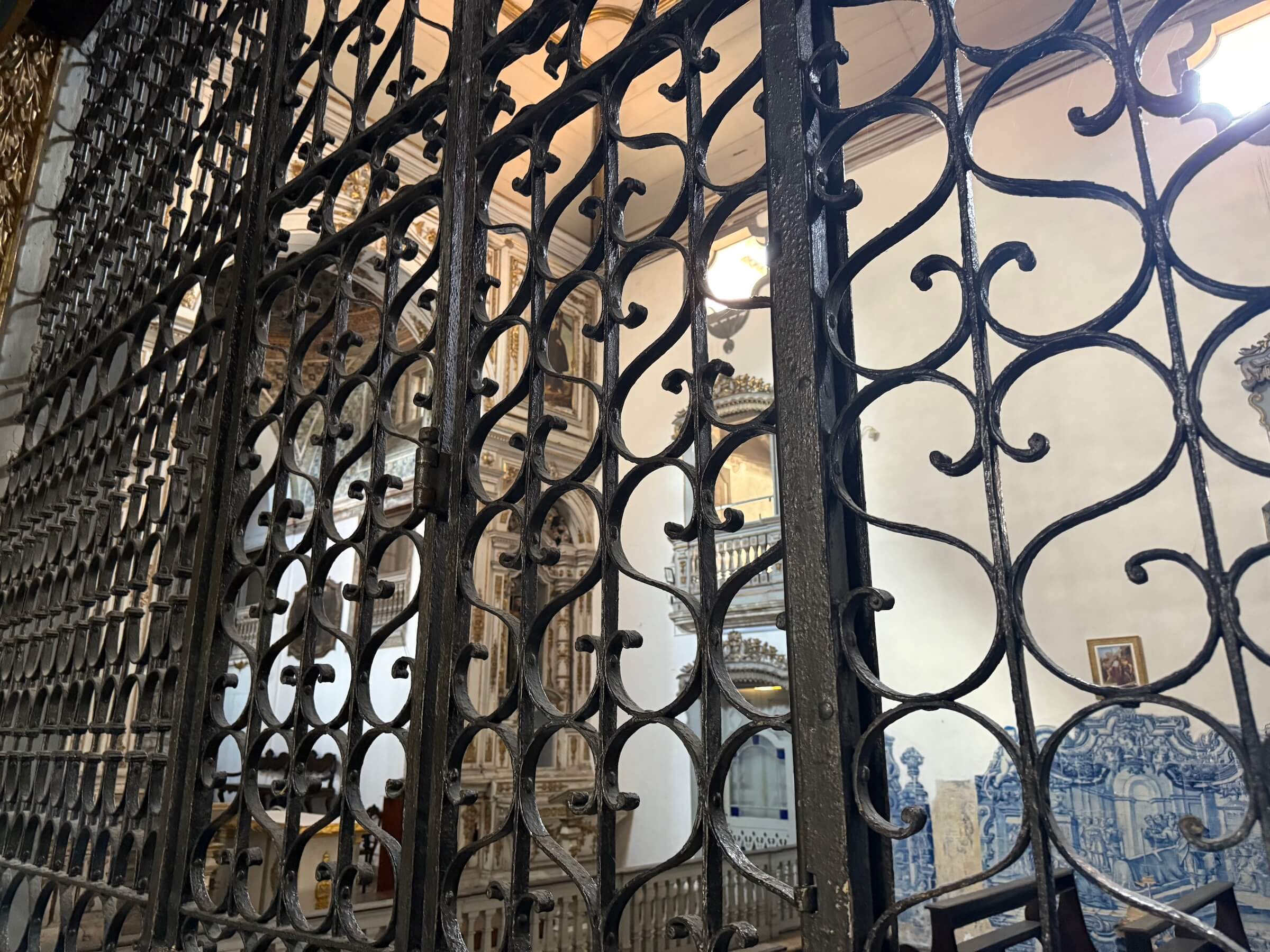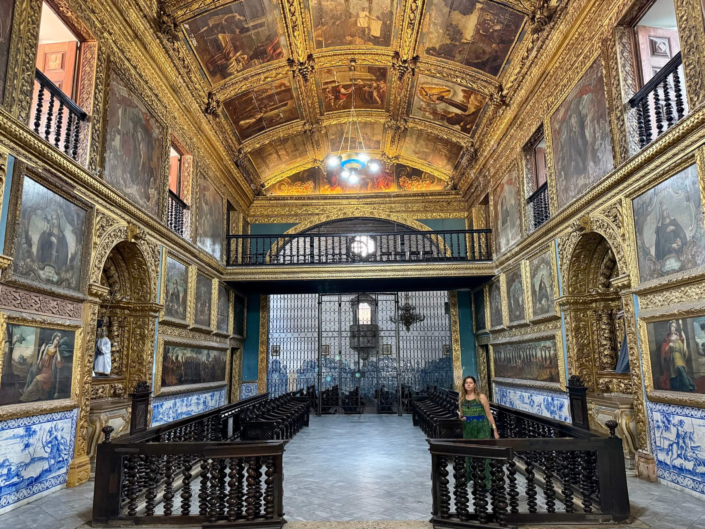 Mas dá para ver a capela do convento através de uma grade na lateral da Capela Dourada, e os azulejos portugueses esmaltados em azul fazem um bonito contraste com a cor do ouro.