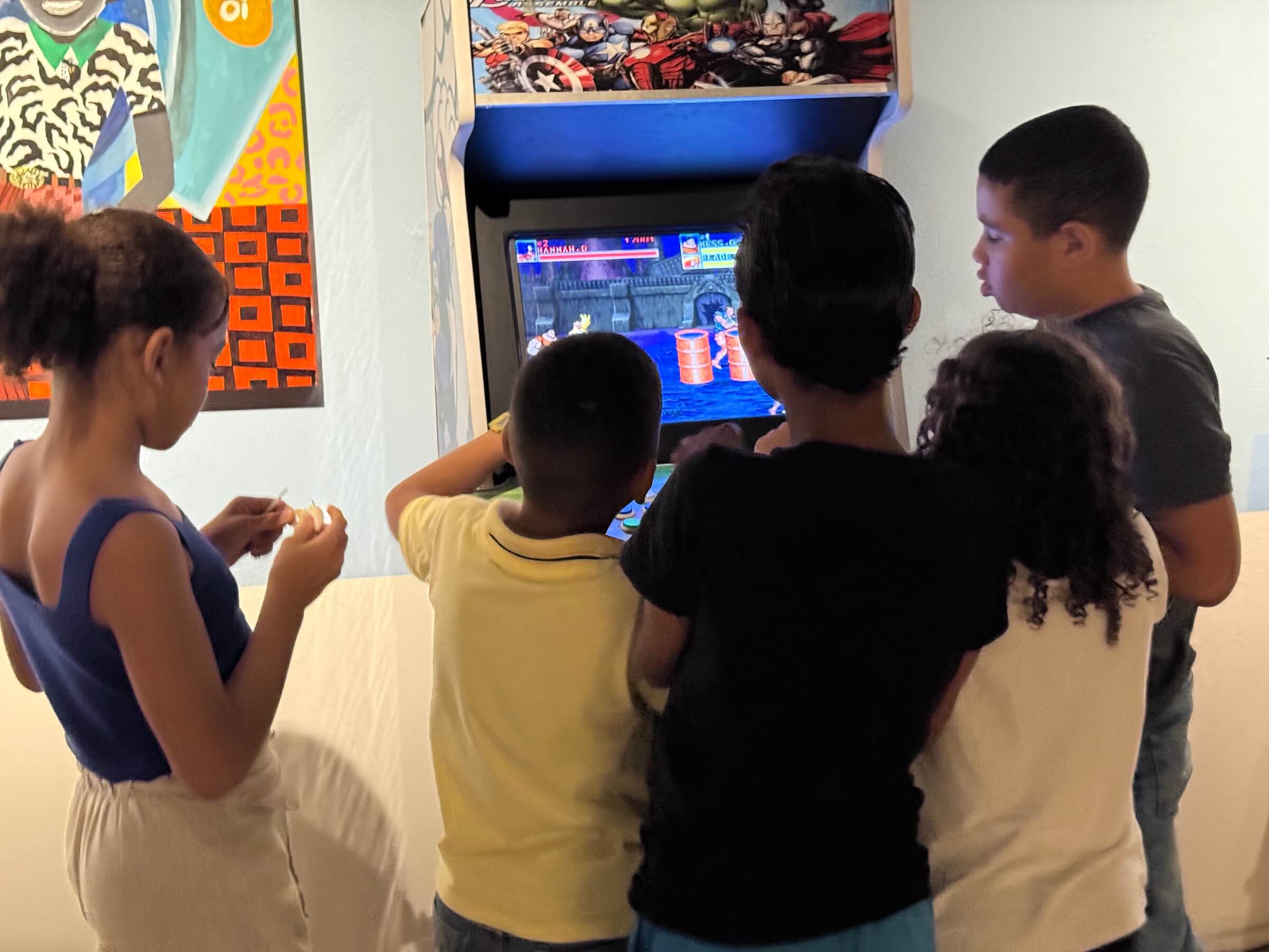 No terceiro piso, estava rolando a exposição temporária Nostalgia, do artista Afro'G. Trazia brincadeiras e brinquedos que marcaram sua infância negra e acabariam moldando sua obra, presente hoje em países como Estados Unidos, Argentina, Holanda e Escócia. O ponto alto entre a criançada era o videogame antigo, fazia tempo que eu não via tantos pequenos rodeando um arcade de fliperama.