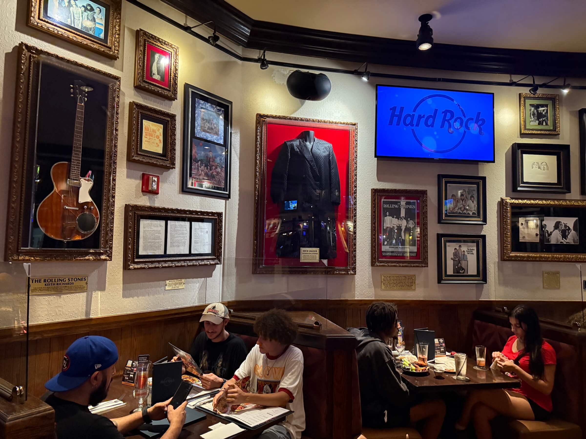 Na verdade, o Hard Rock não é apenas um restaurante; é também um bar que costuma ter apresentações ao vivo. Sua temática é toda relacionada à música e a decoração do lugar é incrível, cheia de fotos de artistas, objetos relacionandos a música e instrumentos musicais. A decoração é tão fantástica que, no meio do restaurante (no bar), há um automóvel antigo girando sobre a cabeça de todos.