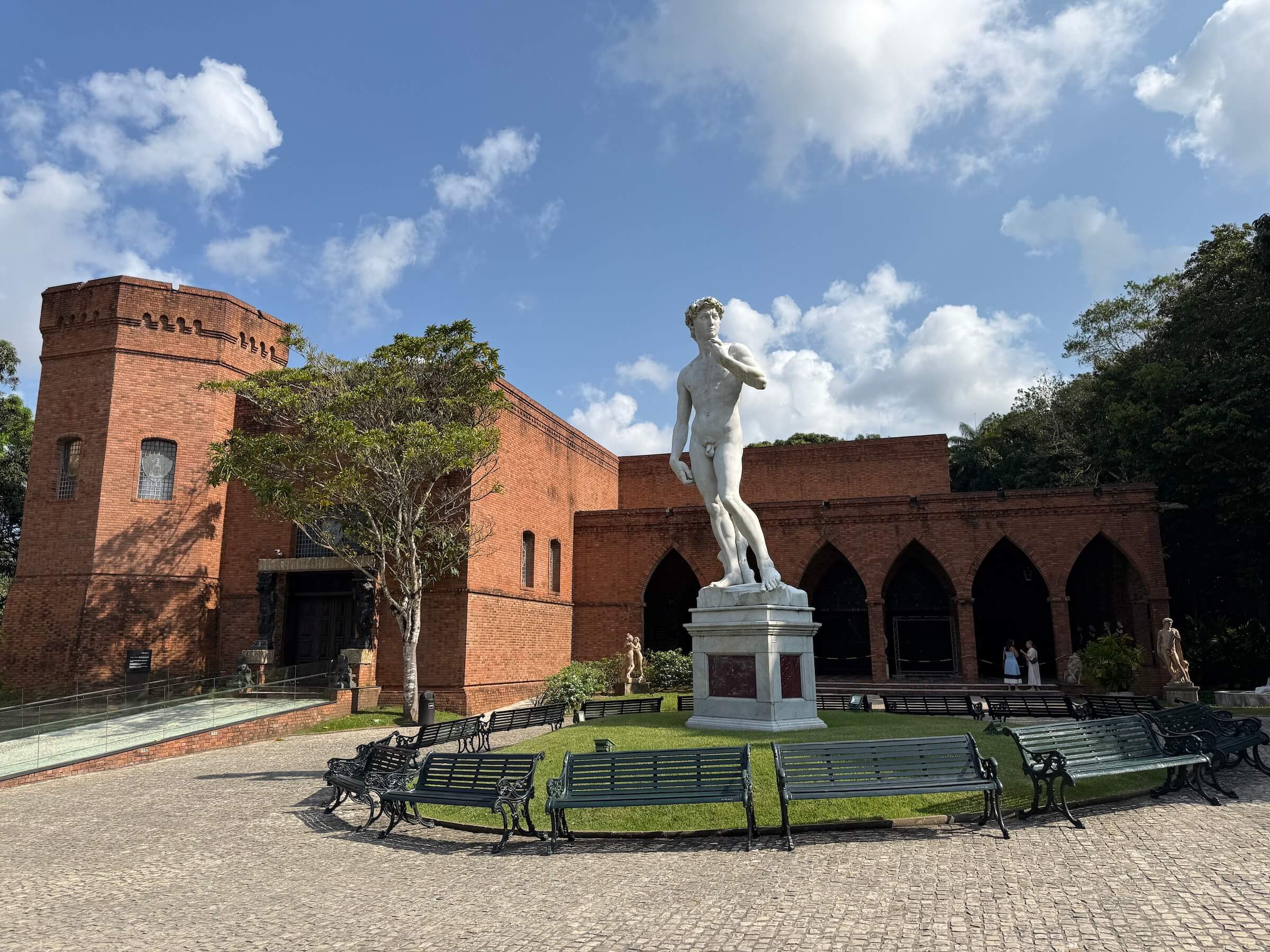Localizado em uma área verde muito bonita, no final de um pomposo corredor de palmeiras imperiais, o Instituto Ricardo Brennand possui exposições permanentes e temporárias, onde é possível conhecer obras brasileiras e de várias partes do mundo. Ainda nos jardins de entrada, deparei com uma escultura do famoso artista colombiano Fernando Botero, conhecido por retratar figuras volumosas.