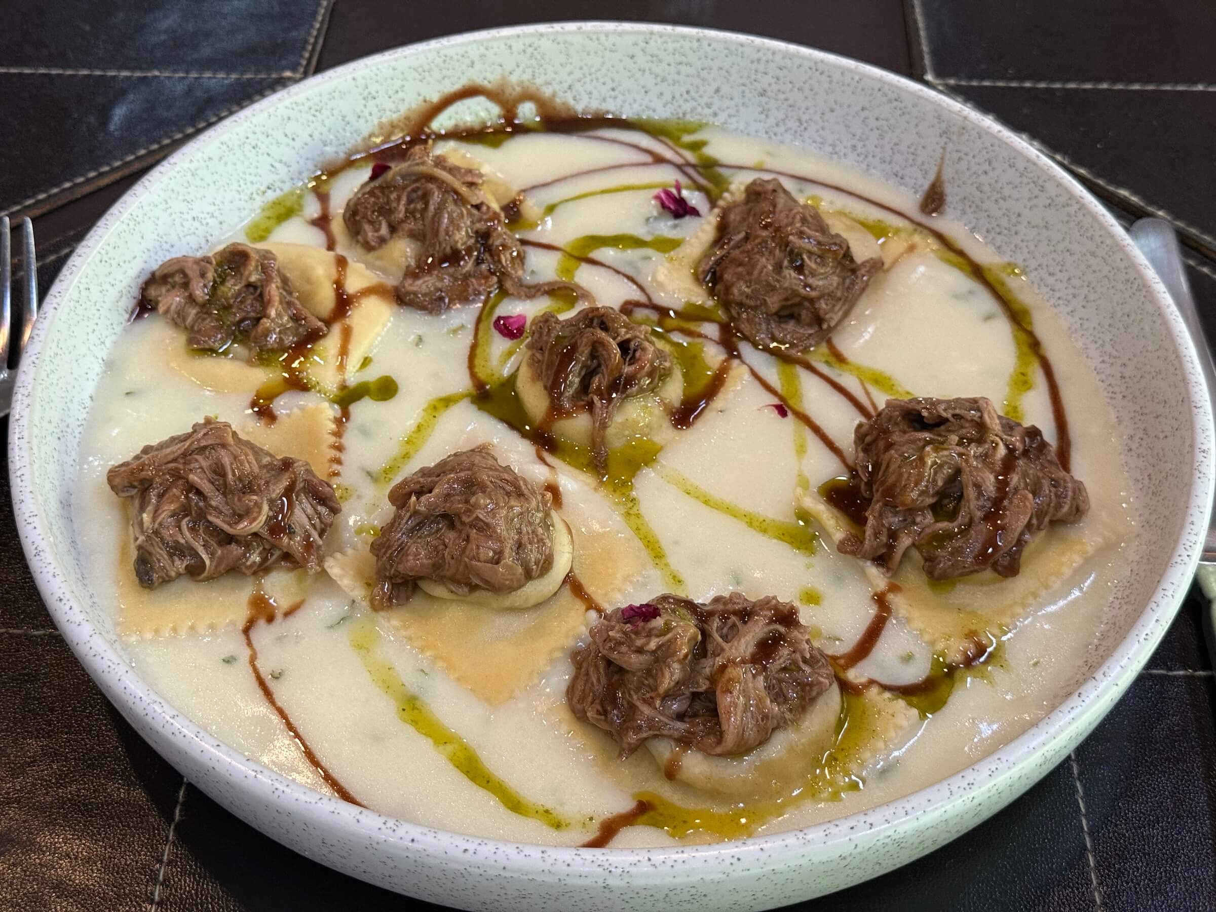Tem um cardápio completo de carnes, pescados, mas eu fui de massa mesmo. O nome do prato era Cordeiro a camponês: ravioli de queijo de cabra (amo!) com ragu de paleta de cordeiro marinado por 48 horas e cozido em técnicas de slow cooking e molho de vinho branco e folhas de hortelã. Estava bem saboroso.