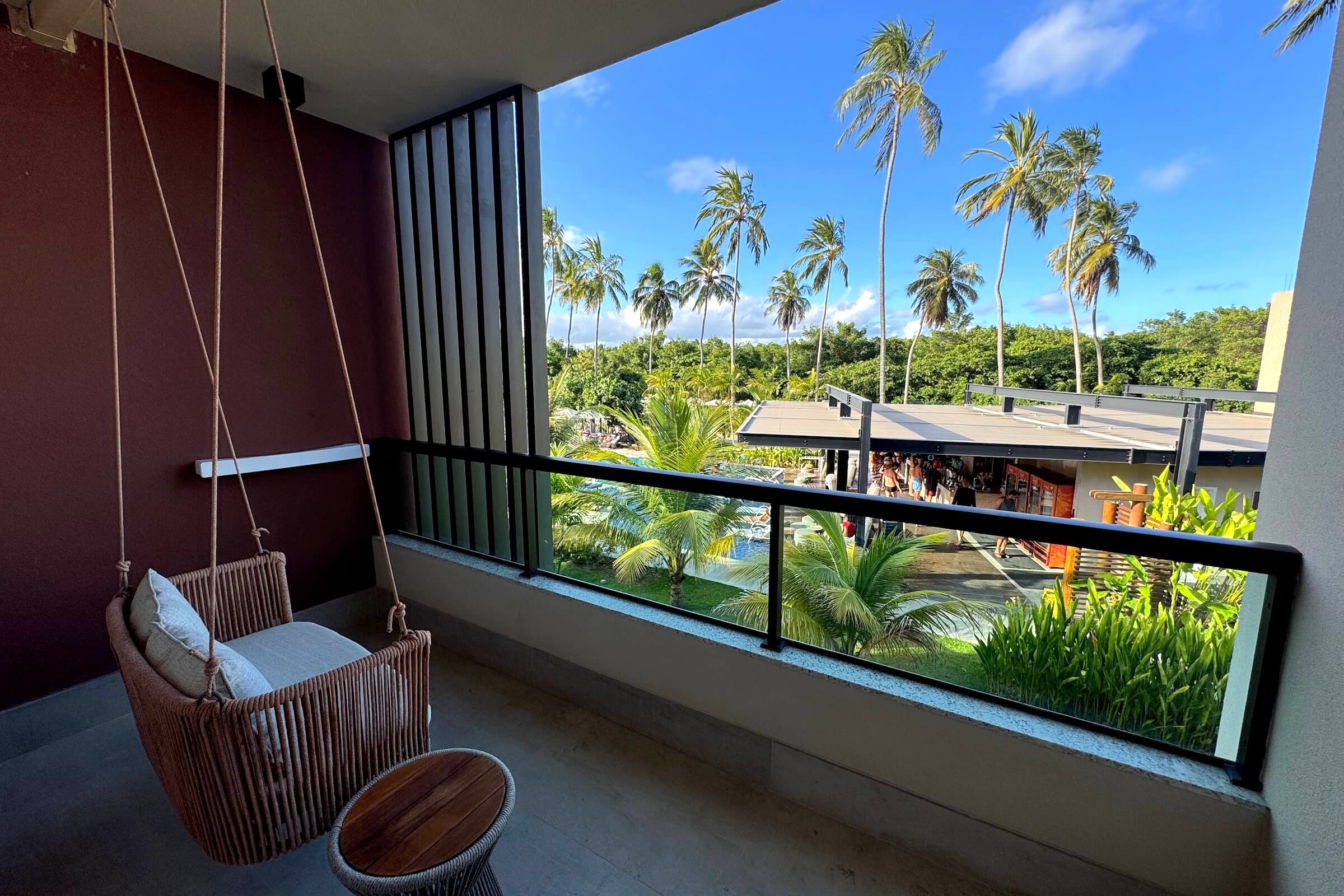 Tanto eu quanto o Sandro nos hospedamos em apartamentos da categoria Garden Suite. O acesso se dá por um caminho entre belos jardins, em uma área mais tranquila do Japaratinga Lounge Resort. Por ali, são vários blocos de dois andares, com quartos acessíveis nos debaixo e um pouco mais privativos no andar superior. Minha acomodação era no segundo pavimento e tinha vista para a piscina e o Bar Mangô, que tinham qualquer ruído abafado com o fechamento da porta da sacada.