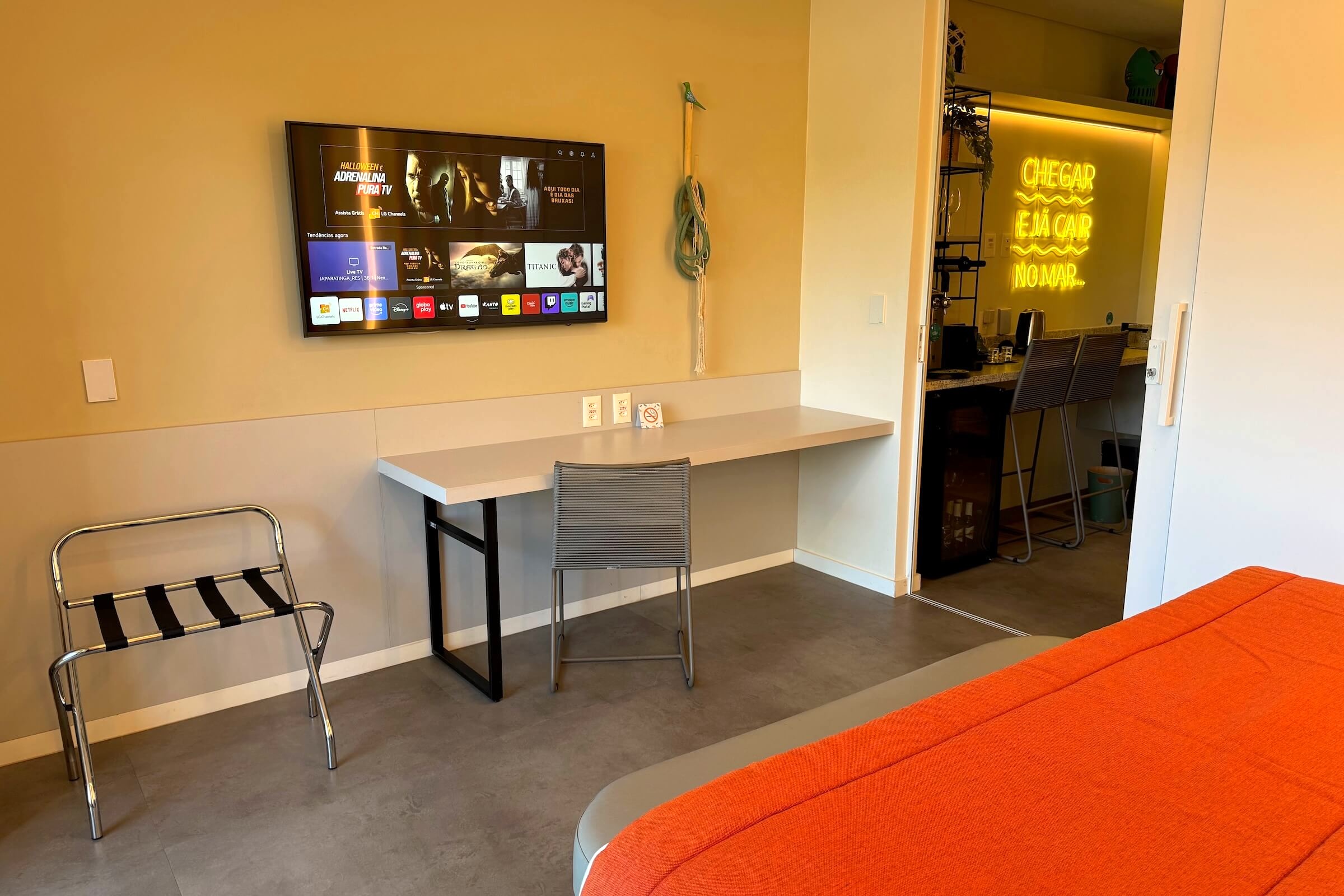 Assim que abri a porta do quarto 455, não teve como não soltar um "uaaaaau. Muito em função do tamanho do apartamento, que conta com banheiro, copa com frigobar, uma área de estar com duas "chaise"que podem ser convertidas em camas de solteiro, um quarto com cama king size e televisão e uma sacada equipada com cadeira de balanço presa ao teto e varal retrátil. Bem próximo à porta, há ainda bastante espaço de nichos e cabideiros para organizar as roupas e o que mais for necessário.