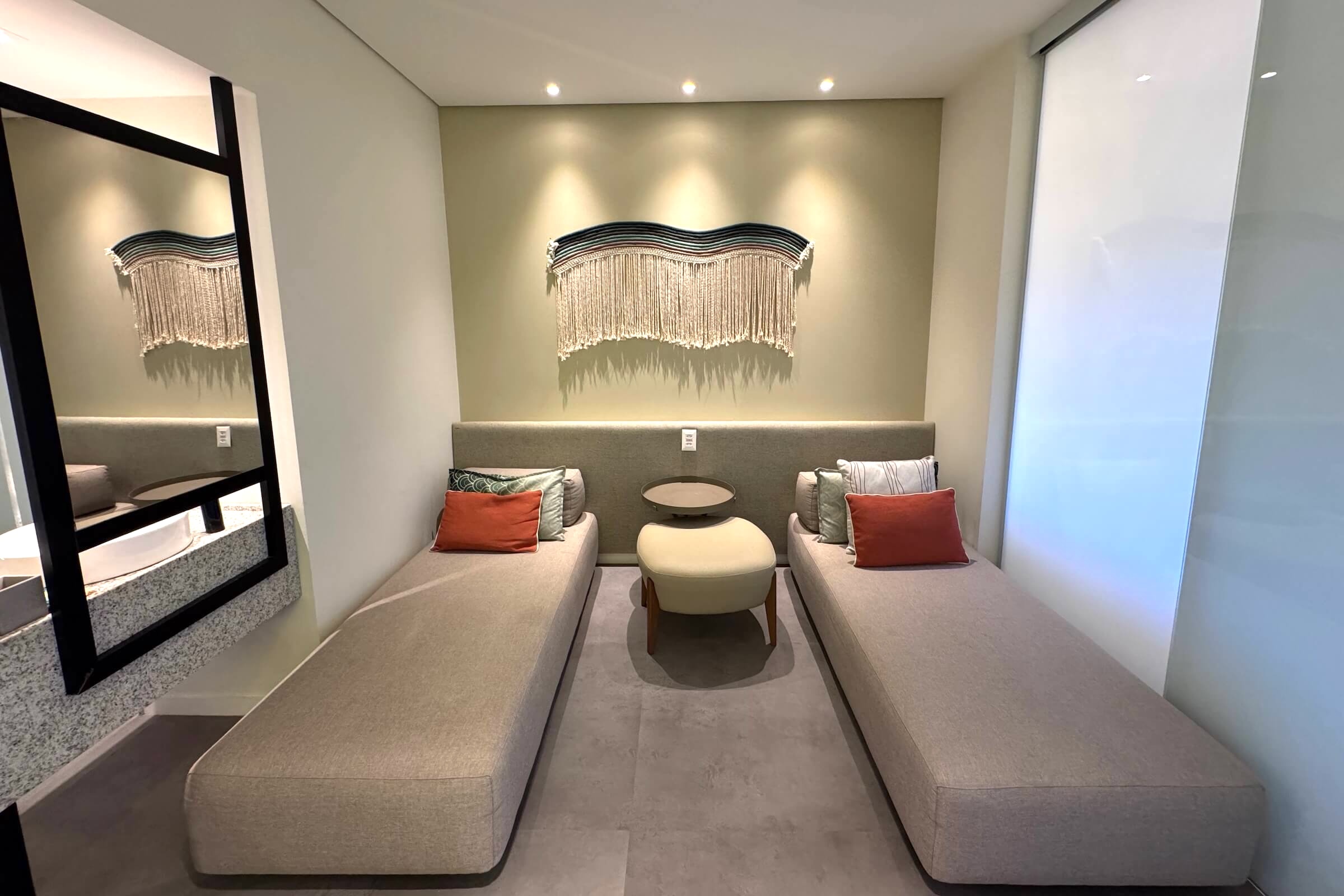 Havia muita, mas muuuita gente, para fazer o check-in. Mas não demorou mais do que 20 minutos para chegar a minha vez de ser atendida. Assim como nos outros resorts do Grupo Amarante, é preciso escanear um QR Code disponível na recepção para entrar em uma fila virtual. Aí foi só encontrar um sofá disponível e aguardar ser chamado.