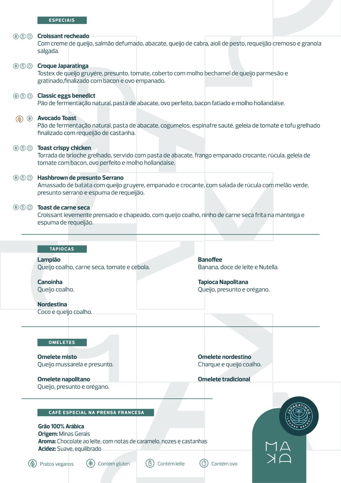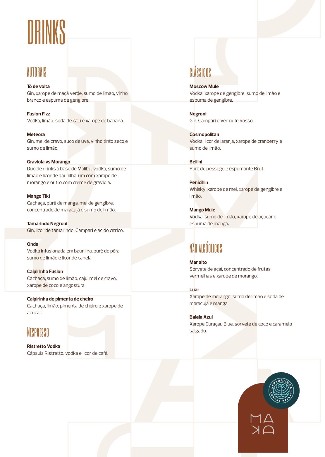 O grande destaque mesmo vai para os preparos feitos na hora, como Avocado Toast; o Croissant Recheado (com salmão defumado, queijo de cabra, abacate e aioli de pesto) e o Toast Crispy Chicken (uma torrada de brioche grelhada, servida com pasta de abacate, frango empanado crocante, geléia de tomate com bacon, ovo e creme hollandaise). Para acompanhar, também são servidos cafés especiais na prensa francesa. Nham! Clique nas imagens abaixo para ver os cardápios de café da manhã, jantar e drinks do Maka: