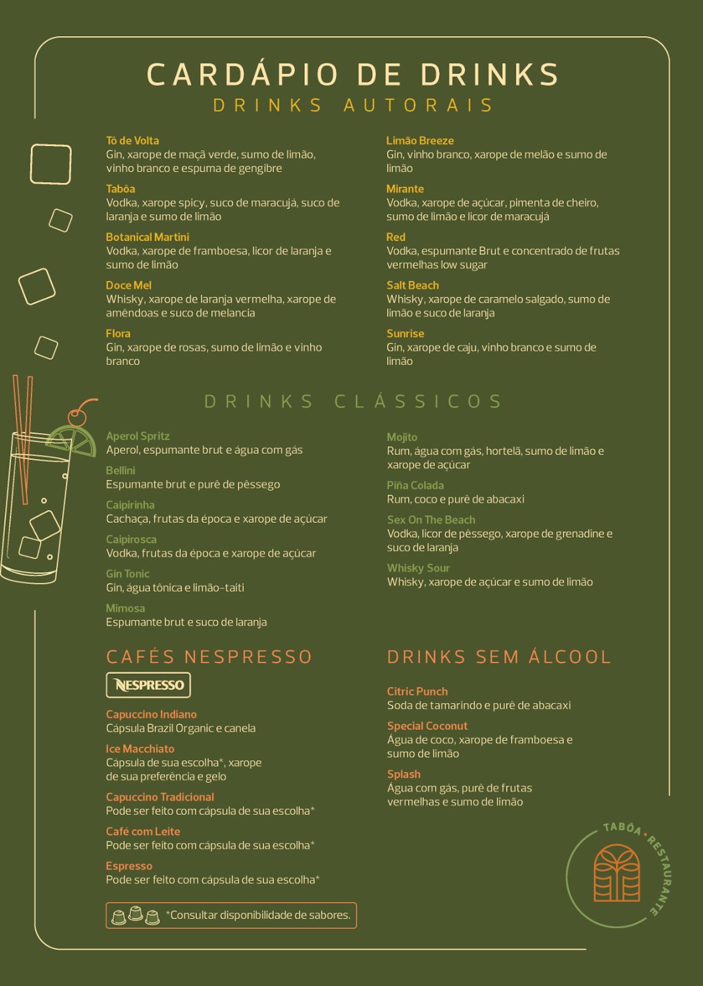 - Mangô Bar: bar da piscina da área Garden, que serve bebidas como cervejas, drinks e espumantes, além de petiscos.