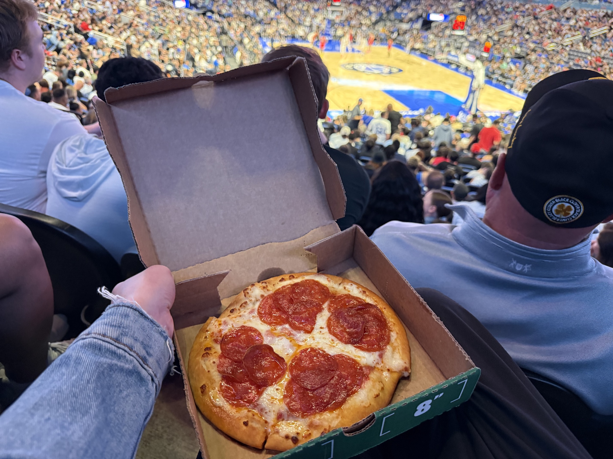 São coisas tipo cachorro quente (basicamente pão e salsicha, do tipo americano), nachos, pipoca, entre outros. A pizza Papa Johns Pizza que eu peguei estava muito boa. Você paga, retira e leva pro seu assento ou pode levar para comer em mesinhas altas com vista para a quadra (se achar alguma desocupada). Ah, tem venda de bebida alcoólica também.