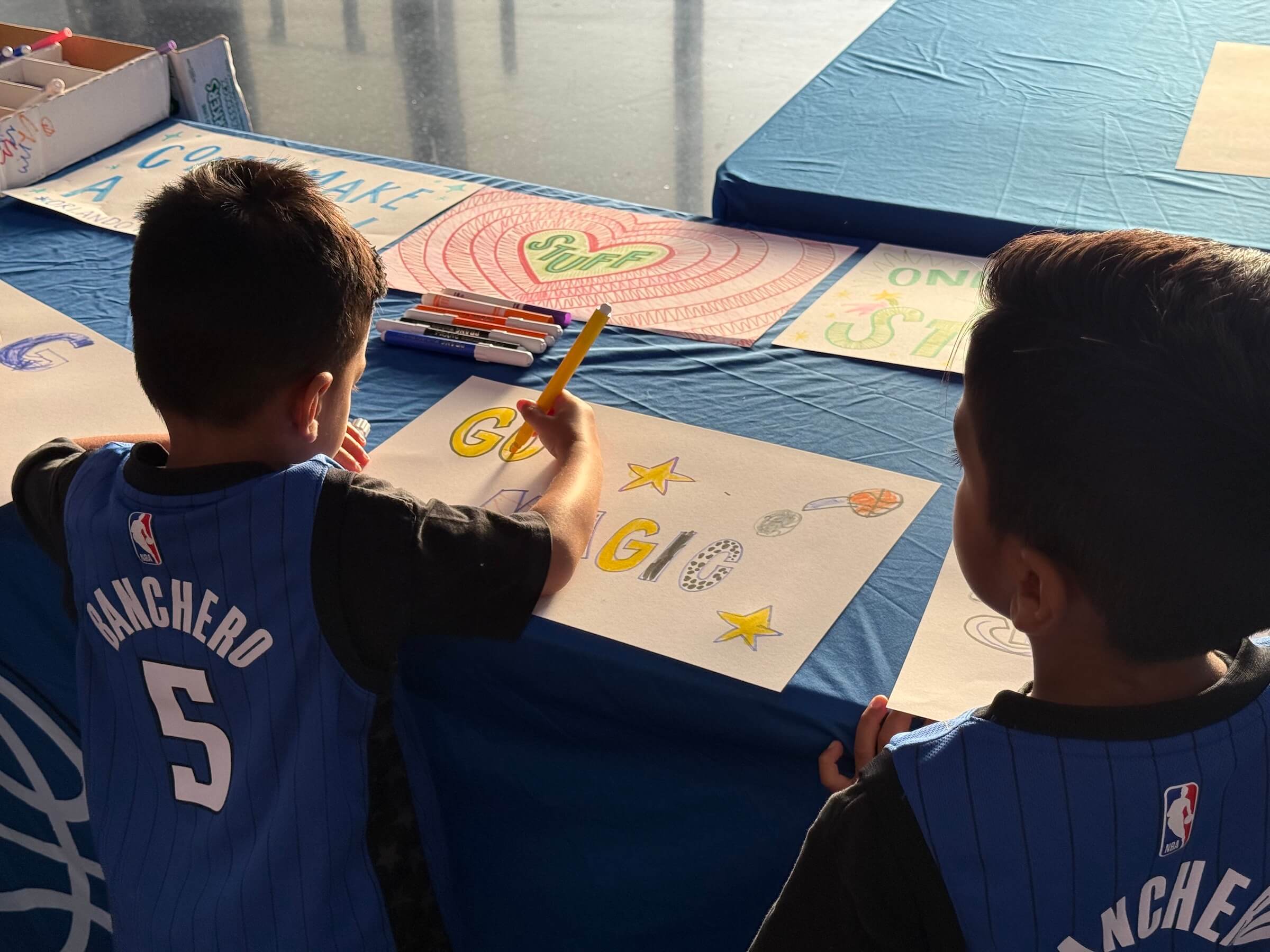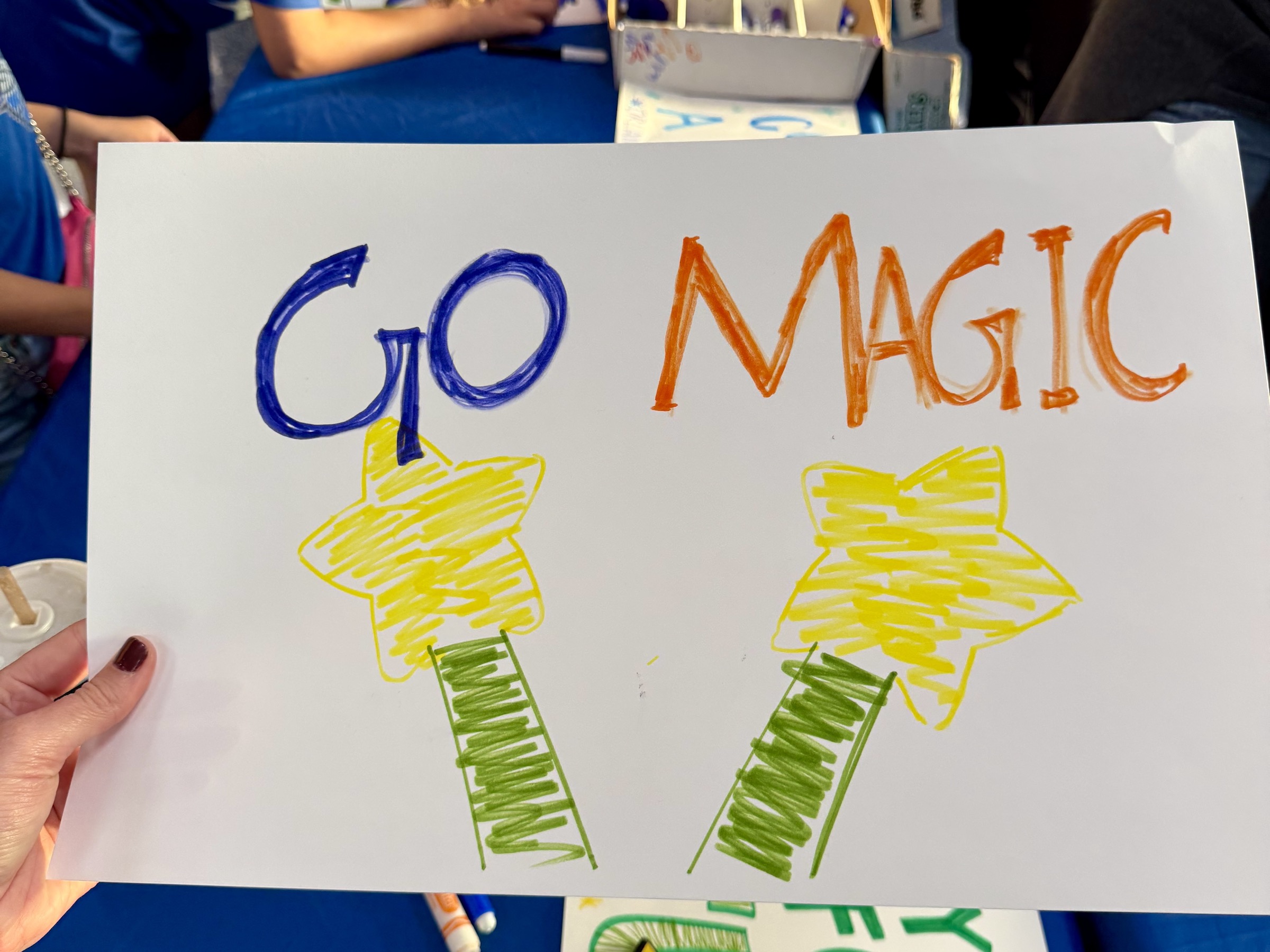 No mesmo piso, dá para confeccionar cartazes para apoiar o Magic. Tem canetinhas e alguns moldes para ajudar nos desenhos. A maioria dos artistas ali eram crianças, mas eu queria a experiência completa e fiz o meu também. Fui bem conservadora na mensagem ("Go Magic"), porém colori bastante pintei as orelhinhas do mascote. Ficou bonitinho, vai dizer?!