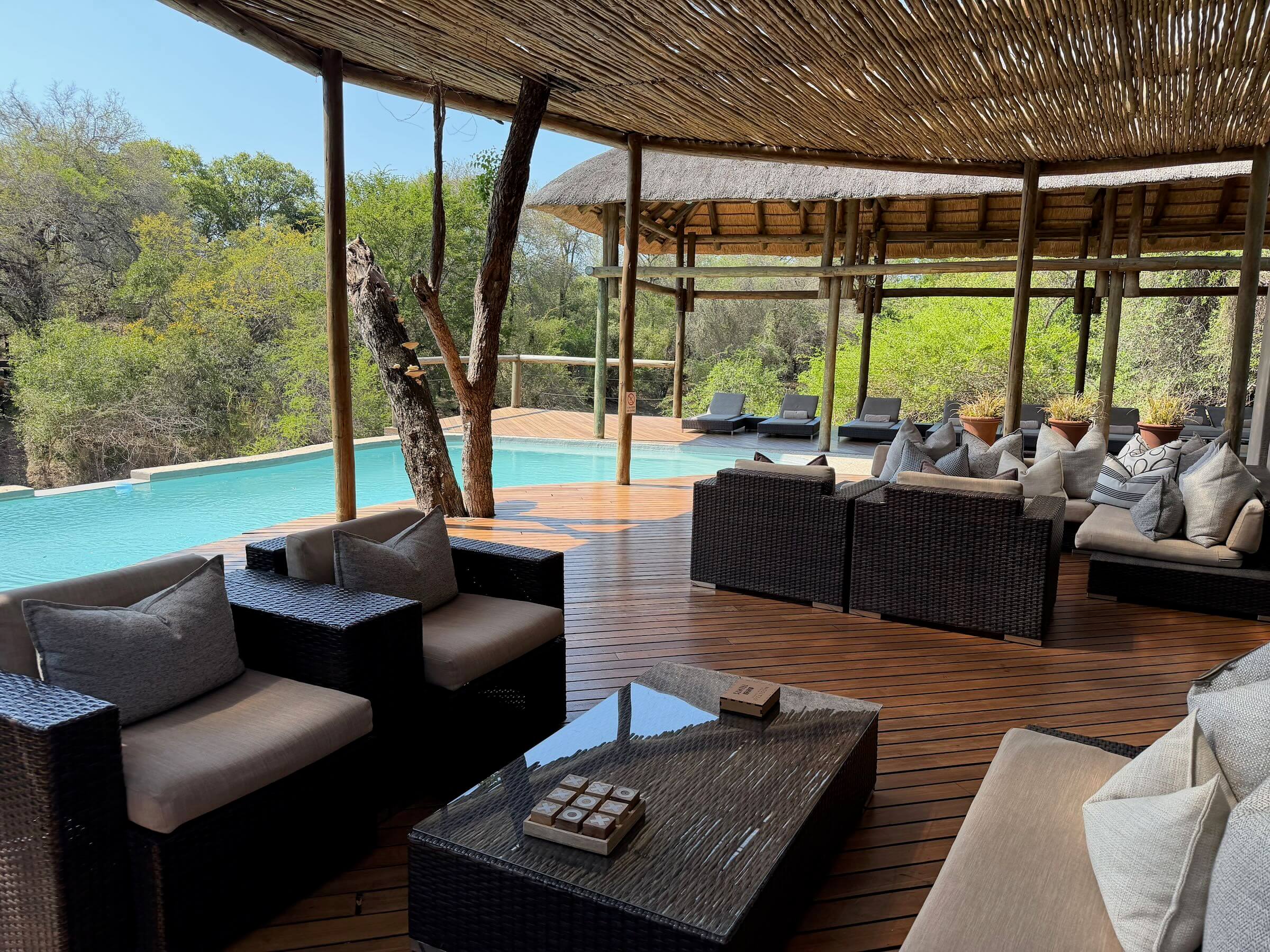 Com a manhã livre, muita gente voltava para o quarto para descansar ou aproveitava as espreguiçadeiras perto da piscina. Às 13h acontecia o almoço e, às 16h, partíamos novamente para o segundo game drive, que seguia até o entardecer — novamente com uma parada estratégica para drinks e petiscos em meio à savana.
