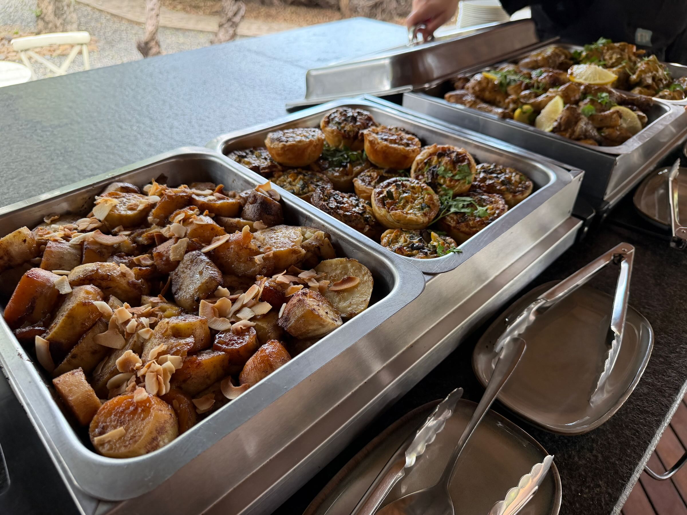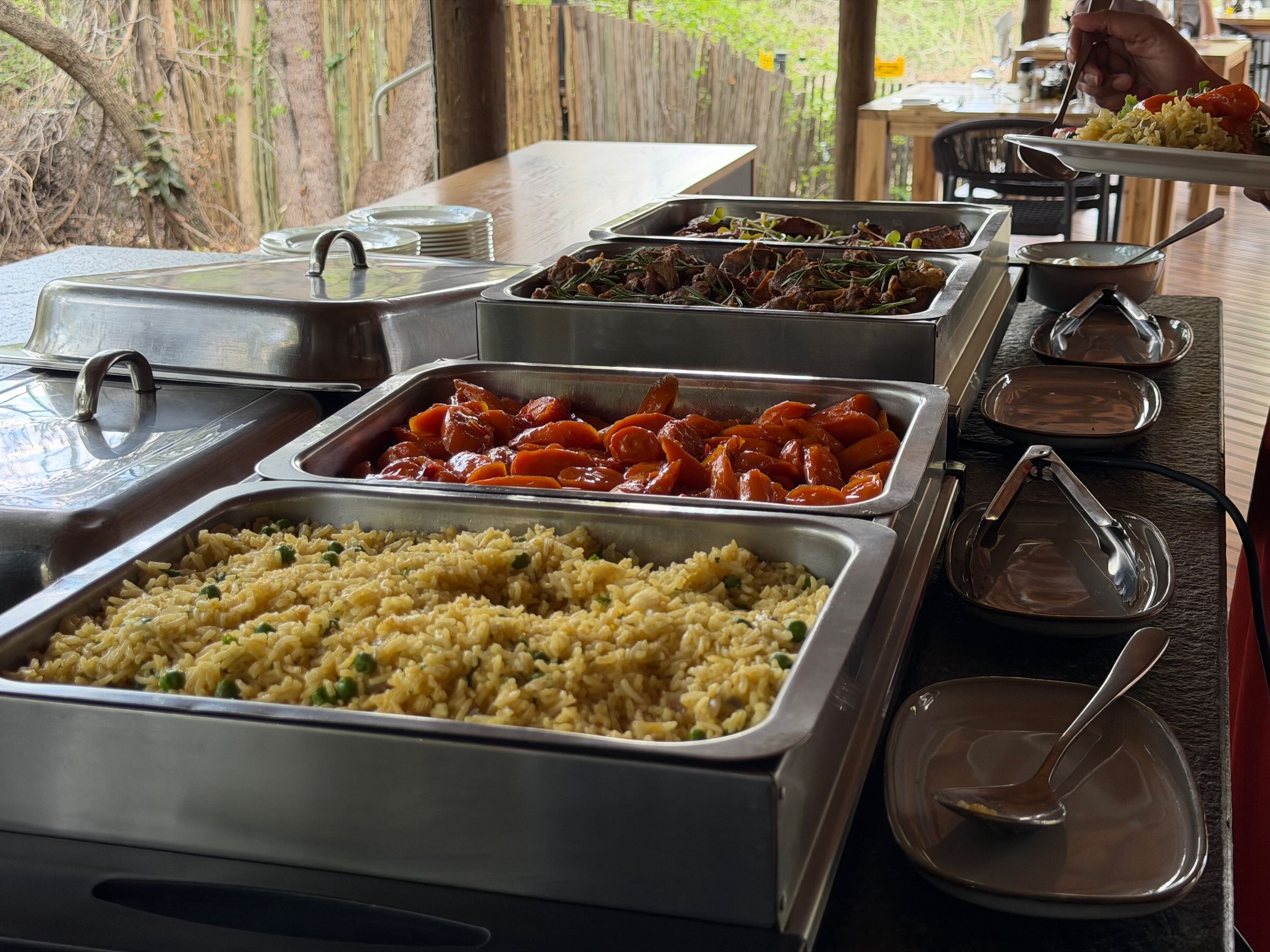 Antes de partir para o primeiro safári do dia, havia alguns biscoitos e bebidas disponíveis para quem quisesse. Logo depois, seguíamos em busca dos animais, em torno das 5 da manhã. No meio do passeio, fazíamos uma parada para um café e, ao retornar ao lodge, por volta das 9h, era servido o café da manhã completo.