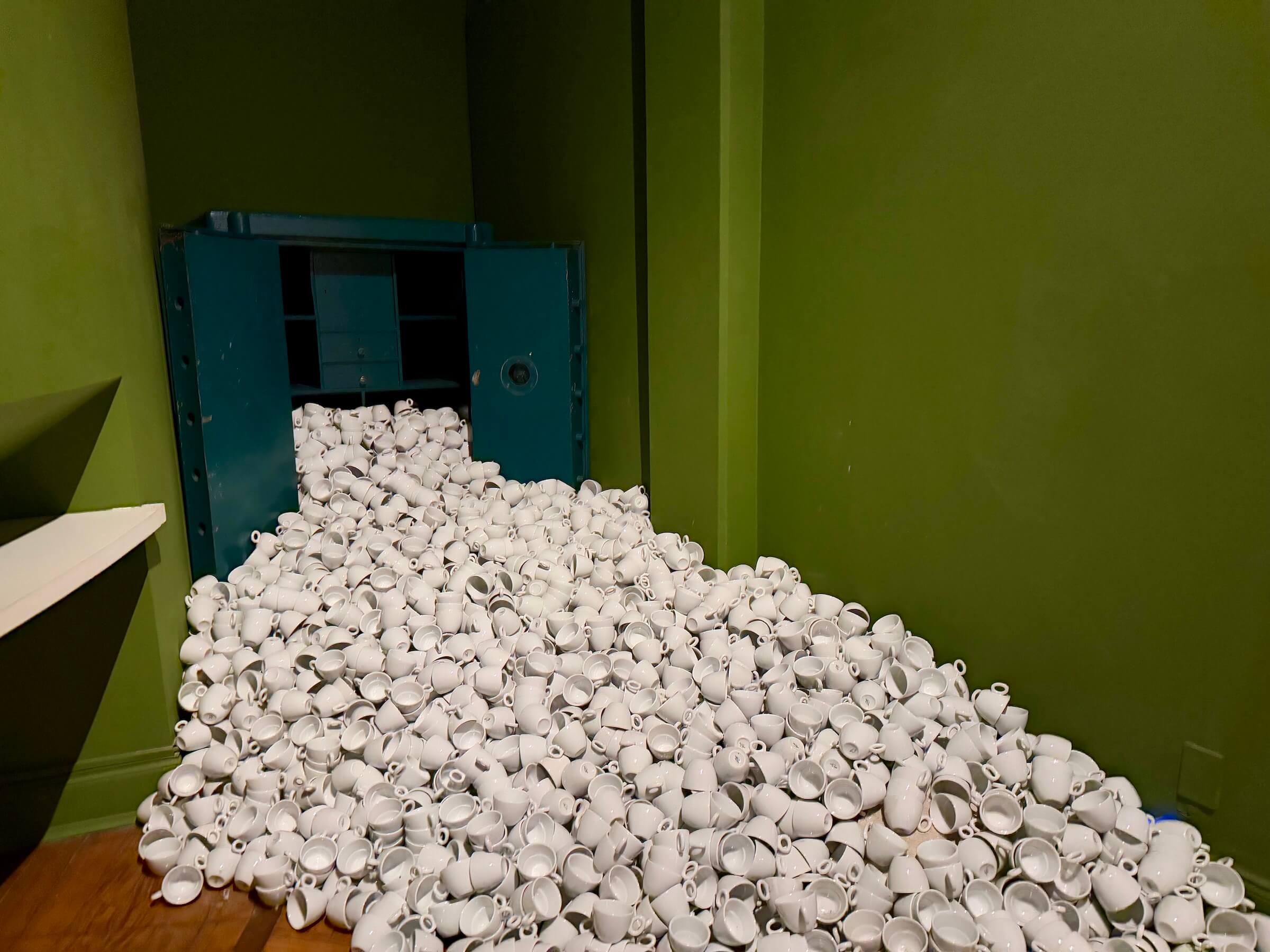 A exposição permanente "A trajetória do café no Brasil" mostra a relação entre a cafeicultura e o desenvolvimento do Brasil. Você ainda vai ver as profissões relacionadas ao café antigamente ali em Santos, vai ver ambientes lúdicos que simulam uma cafeteria antiga e outra cafeteria futurista, enquanto aprende curiosidade sobre a história, a evolução de preços, de costumes, as especialidades, etc. Tem até obras de arte, como essa da foto. Flor do Desejo, de Raquel Fayad, conta com 3.000 xícaras e 1000 pires brancos de louça.