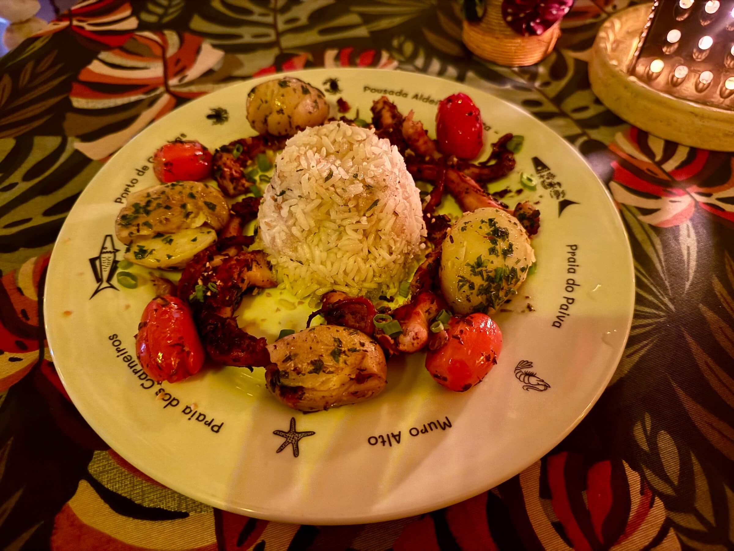 - Beijupirá (fotos abaixo): para um jantar especial, pois não é muito barato. Tem a decoração mais original da vila, com uma pegada praia-chic, uma delícia. O cardápio é reconhecido pela criatividade, unindo peixes e frutos do mar a ingredientes regionais. Eu fui de Polvo Jangadeiro (polvo com azeite, tomate, batatas e arroz de pão crocante). Podia ter um pouco mais de polvo, mas estava saborosíssimo.