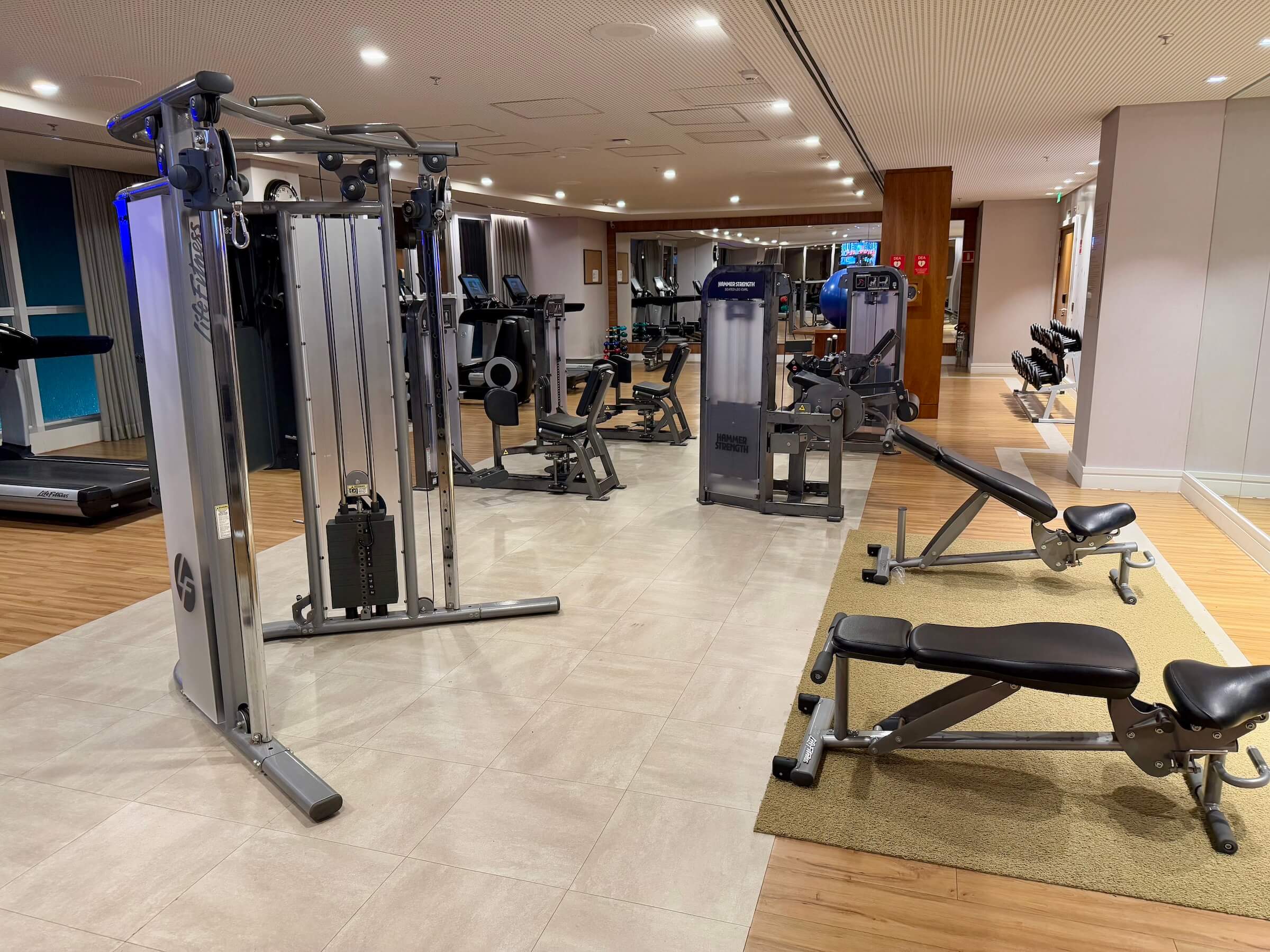 A piscina é coberta e climatizada. A academia é uma das melhores que já vi em hotel, com muitos equipamentos, esteiras novas e até toalhinhas dentro do freezer pra ficarem geladinhas. Muito clean, ampla e refrigerada. O hotel também tem uma sala kids, não muito grande, mas colorida e convidativa, e uma sala com ping-pong e pebolim.