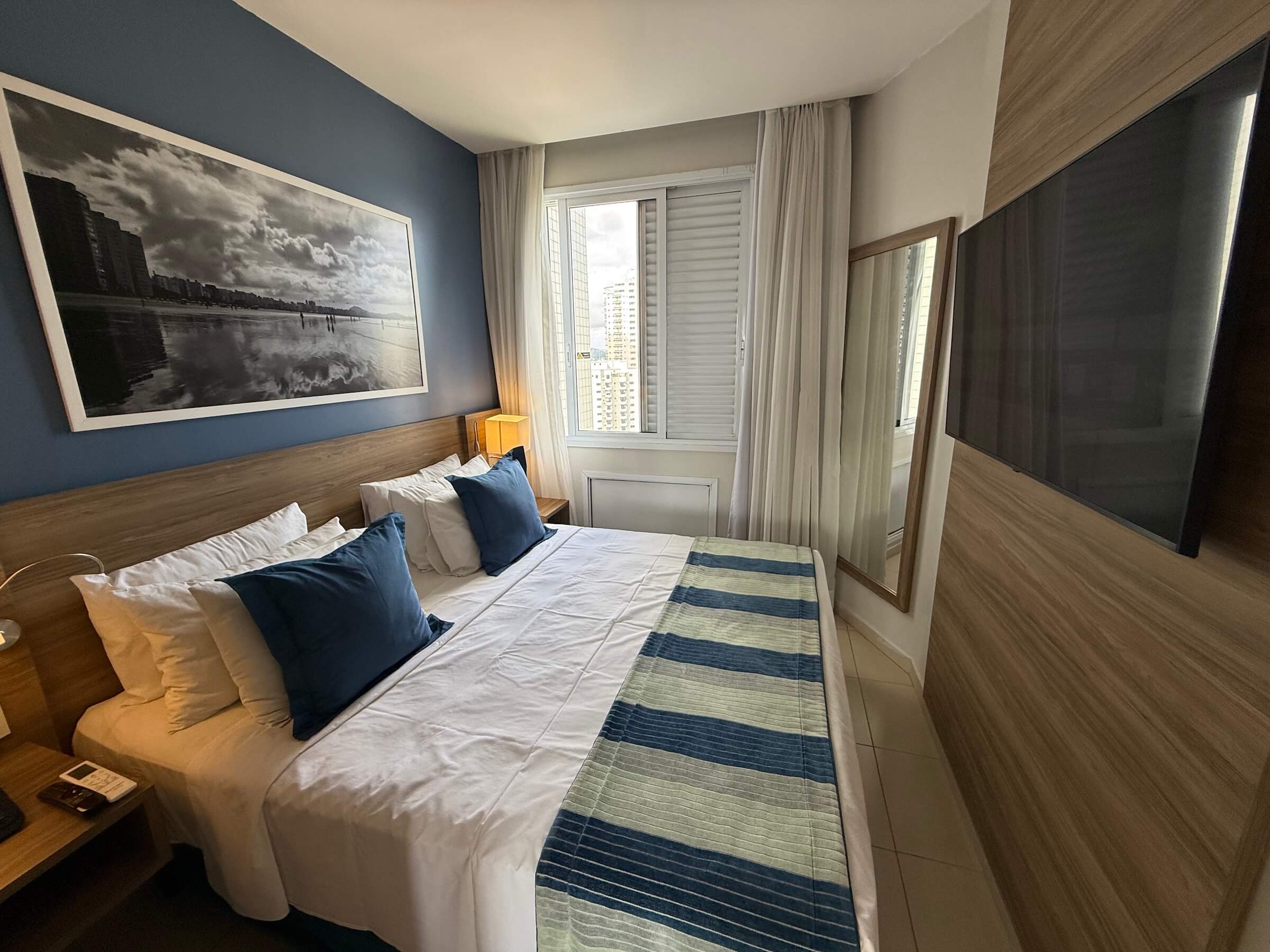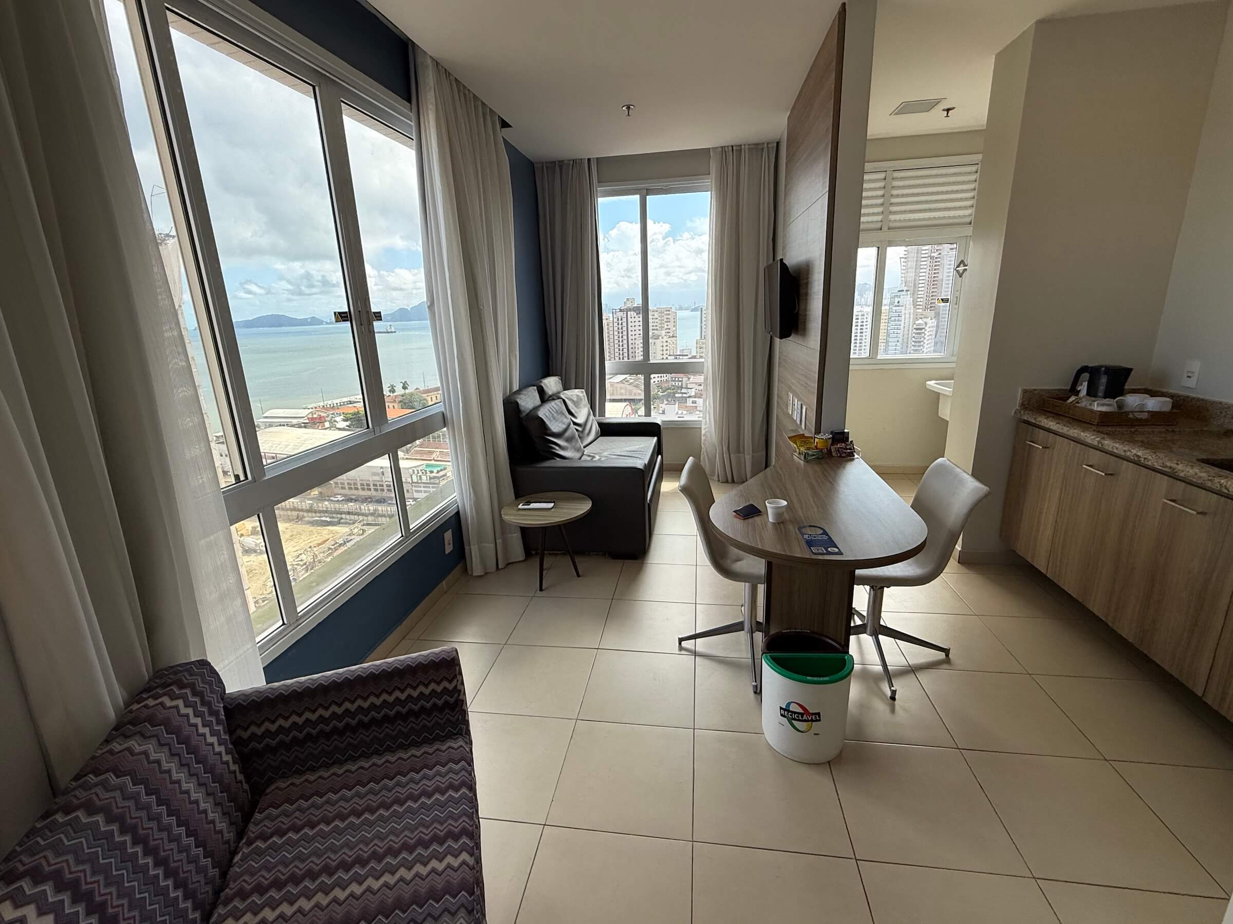 Eu peguei um apartamento super espaçoso, com vista para o porto, uma pequena sala e cozinha com geladeira e micro-ondas, dois banheiros e um quarto confortável. Ponto para a roupa de cama gostosa e a Smart TV gigante. Achei que teve um bom custo-benefício.
