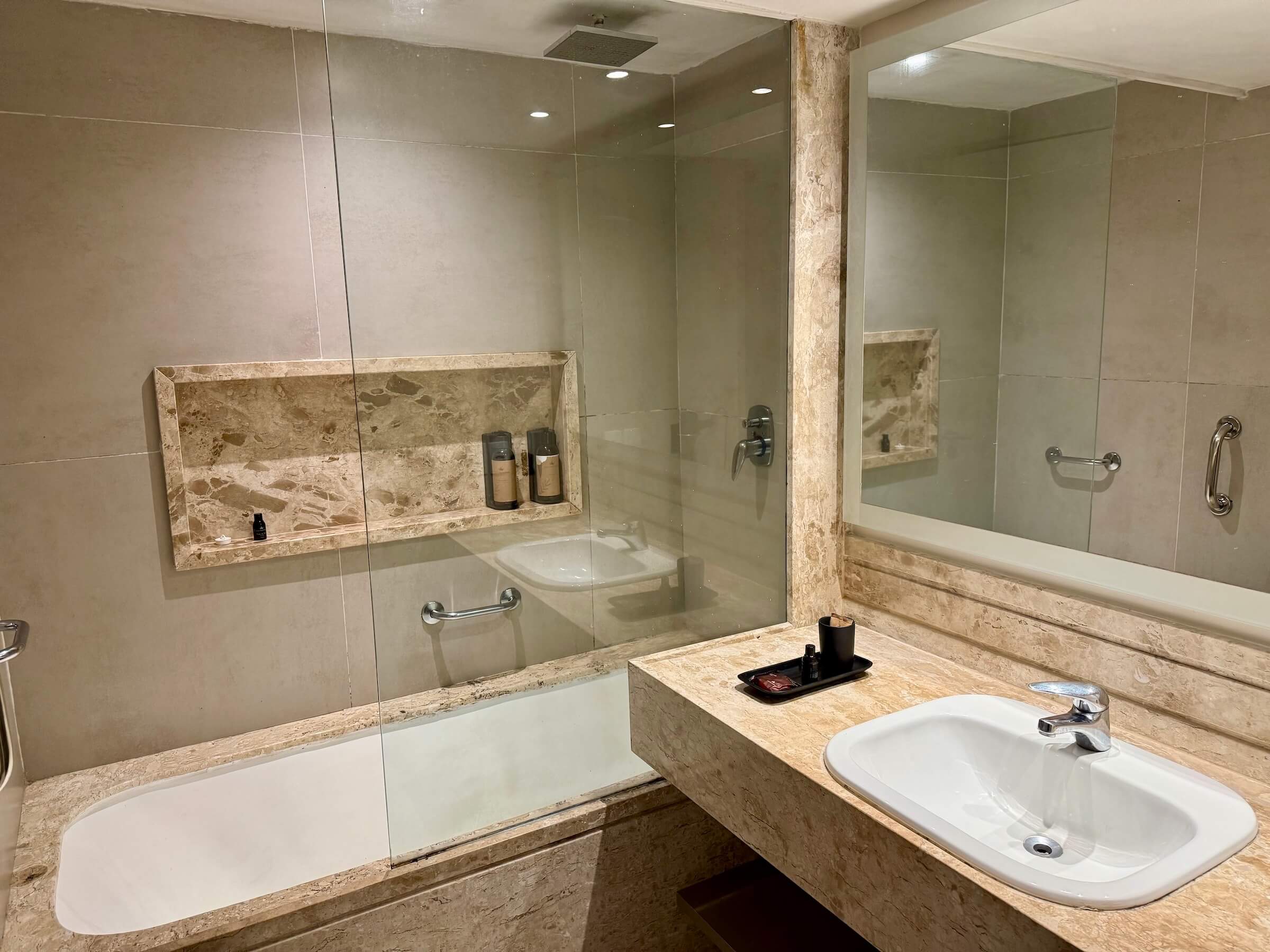 Mas vou compartilhar um erro meu, bem amador, para você evitá-lo. Acabei reservando um quarto com acessibilidade sem querer, então a cama era mais baixa e o box do chuveiro era diferente também, nivelado ao chão e com cortina de plástico, justamente porque não pode ter obstáculo ao cadeirante. A tonta aqui conseguiu alagar todo o banheiro. Pedi para trocar de quarto, até porque me senti culpada de estar usando um quarto adaptado sem precisar, mas não tinha disponibilidade.