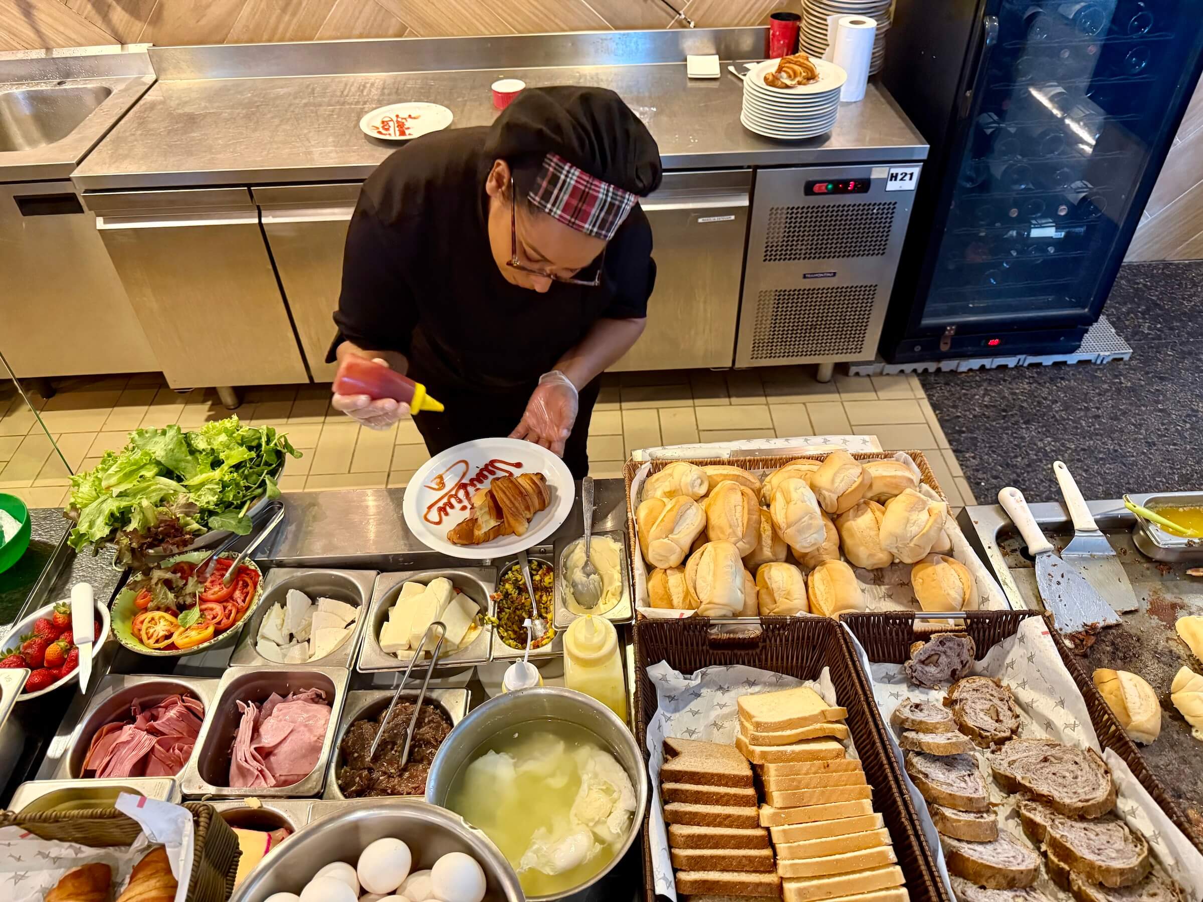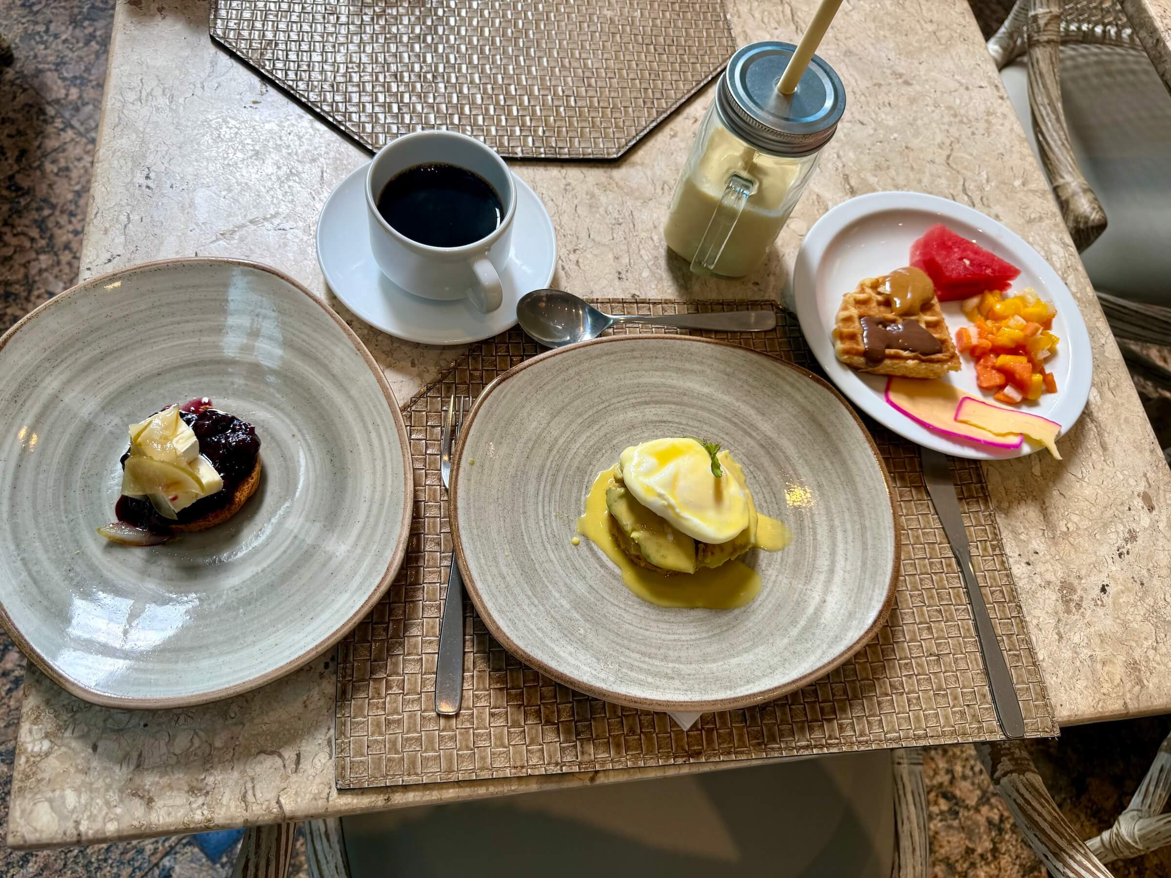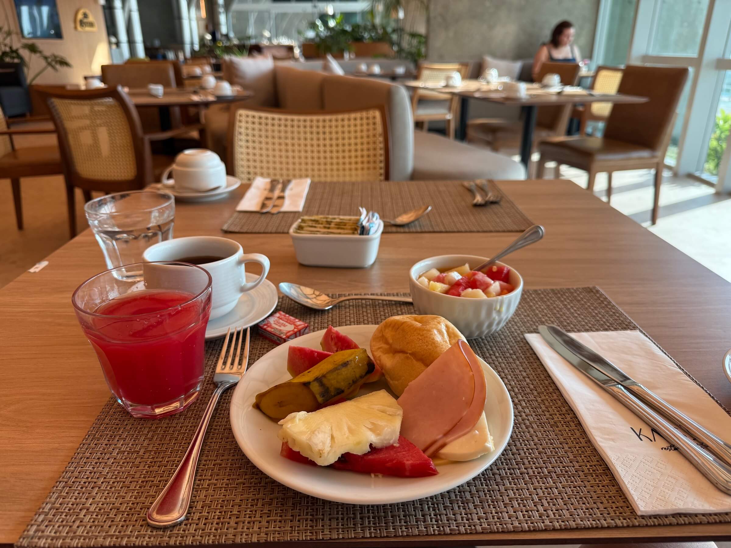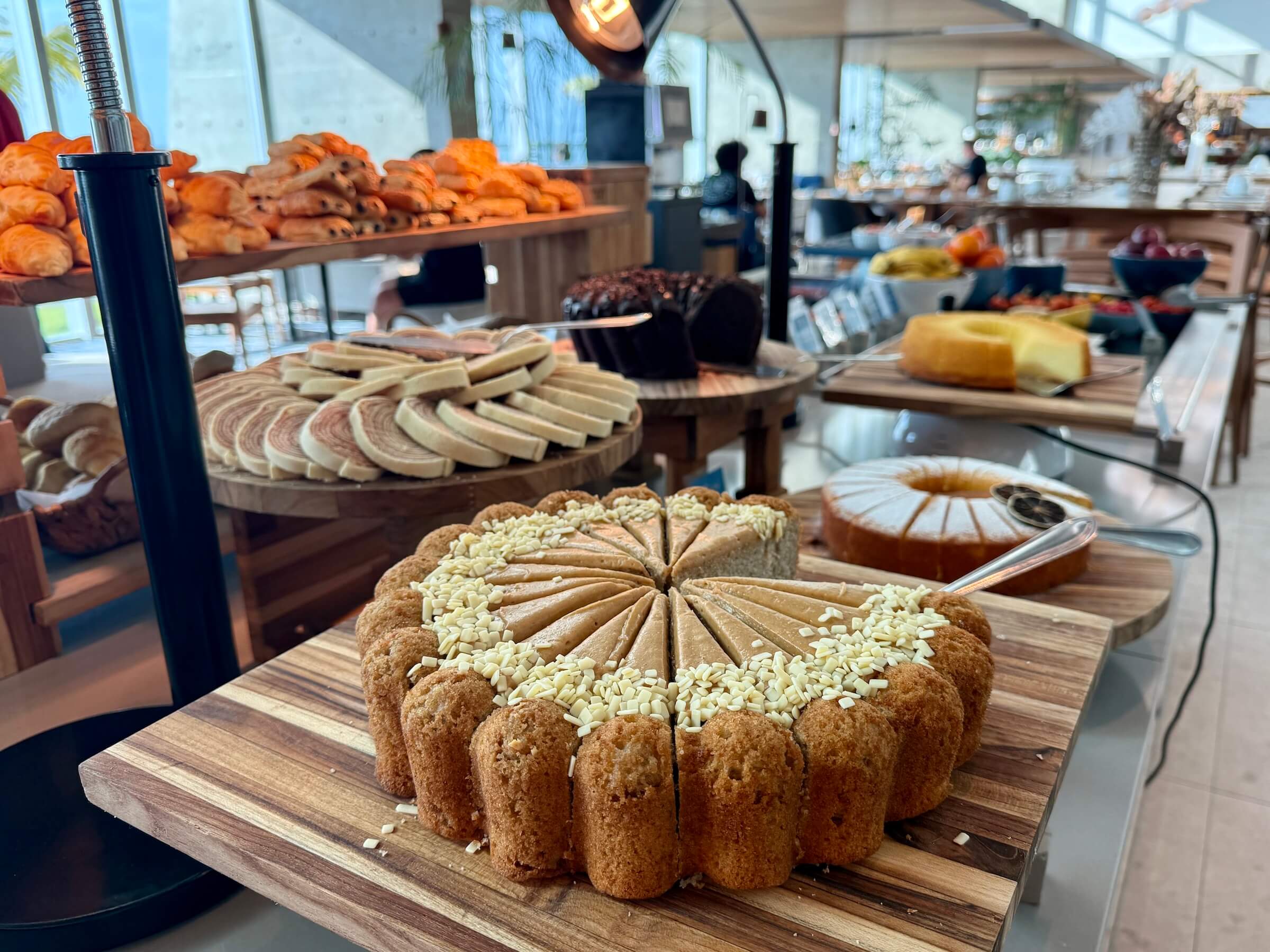 O bufê era super completo, com pães, frutas, e alguns pratos bem regionais, como bolo de rolo, bolo souza leão, carne de sol com inhame. Mas ainda tinha ilhas com pratos feitos na hora, de tapiocas a croissants enormes recheados, e tinha dia de smoothies. As opções mudam a cada dia da semana, impossível enjoar.