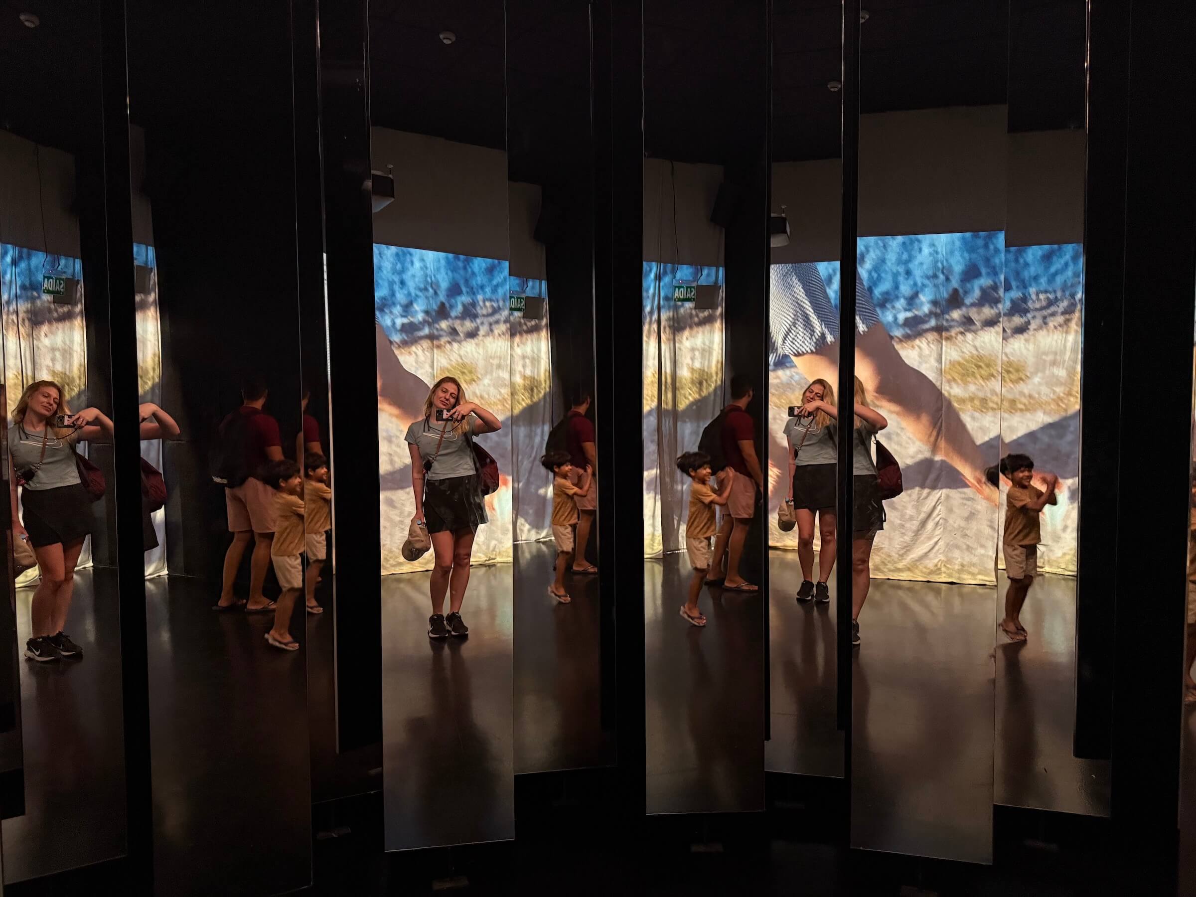Nesse mesmo piso, tinha duas salas de exposições interativas. Em uma tinha uma sala de espelhos, com um telão que exibia uma dançarina em ação e convidava todo mundo a dançar junto.