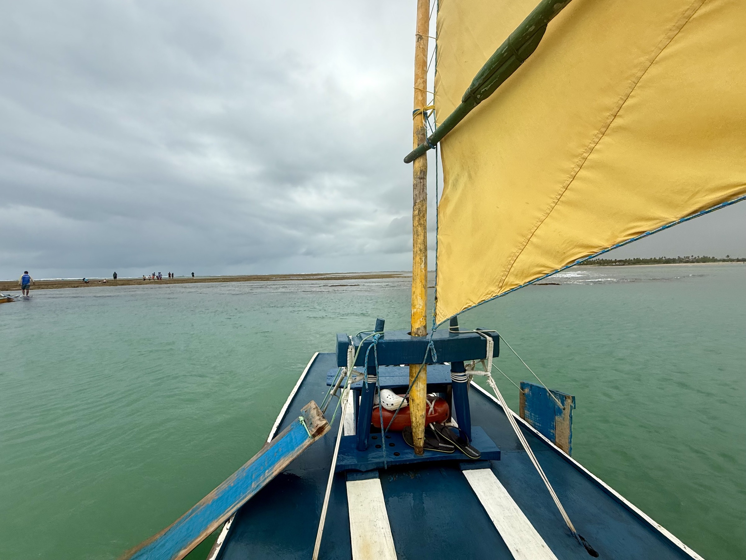 Não é a mesma jangada das piscinas naturais: elas não têm velas, são movidas com uma vara bem extensa. O jangadeiro vai na parte de trás, de pé, fazendo o deslocamento no braço. Mistura de Veneza com Brasil, né?! Até rola de fazer esse passeio com maré baixa, mas saiba que o rio vai estar mais miguadinho, pois o nível do rio baixa muito quando o mar recua.