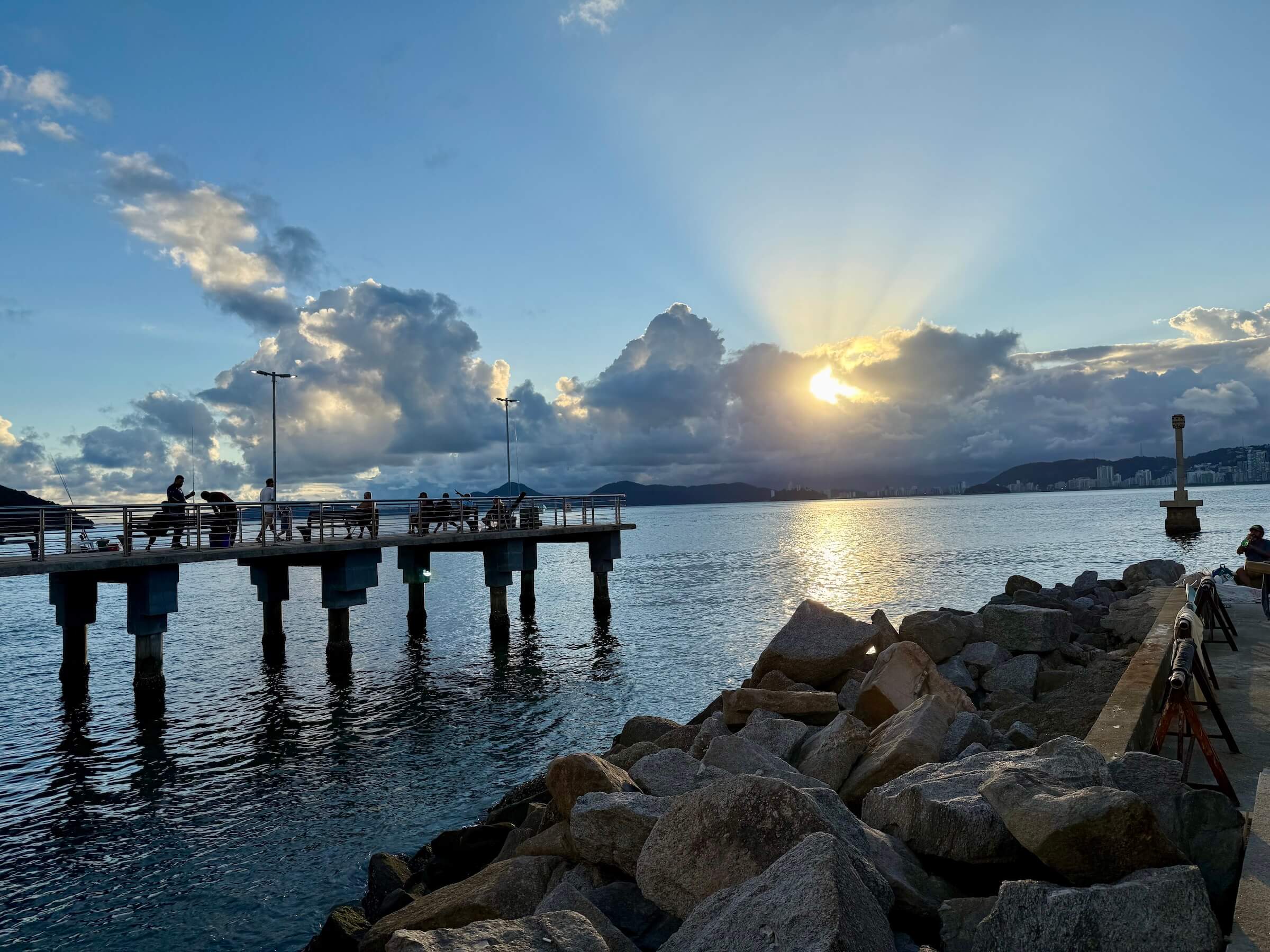 A praia é pequena, o cantinho da orla antes do porto, mas a região se destaca pelo passeio sobre barreiras de contenção do mar, com mosaicos de pedra no chão, parapeitos branquinhos e postes românticos. Não deixe de ir até esse calçadão elevado para assistir ao pôr do sol enquanto come um açaí nos quiosques locais. Foi um dos meus momentos favoritos da viagem à Baixada Santista, aquela hora que eu pensei: "olha, eu moraria em Santos".
