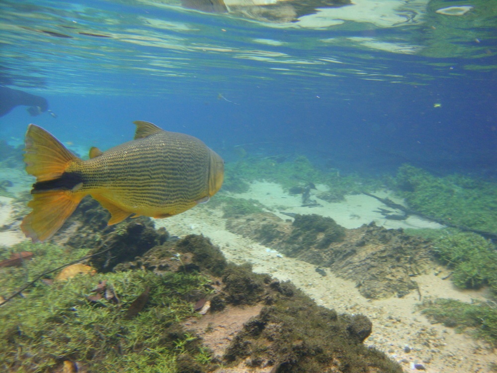 Já foram registradas mais de 65 espécies de peixe por lá, mas o que eu mais vi foi piraputanga. Peixe muito comum dessa região do Mato Grosso do Sul, tinha um cardume lindo dele no começo da flutuação, mais especificamente na área delimitada para o treino. E outra coisa incrível dessa flutuação é que a gente pode ver ressurgências, ou seja, nascentes que alimentam o rio, movimentando a "areia" no chão.